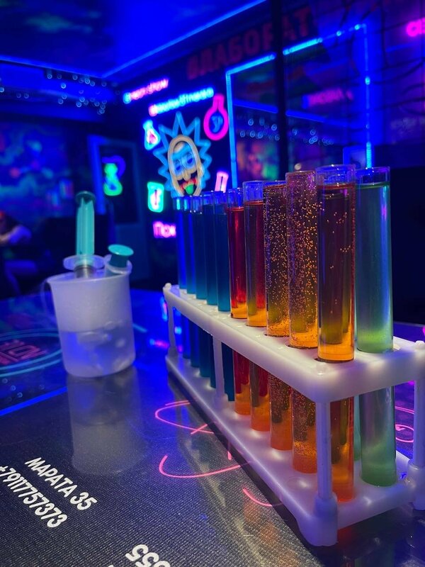Очень необычное и кайфовое место, напитки подаются в пробирках 🧪, огромный выбор вкусов, можно брать сразу сеты. Также есть паровые коктейли с эффектной подачей💨💨💨 Персонал очень дружелюбный, помогли с выбором коктейлей, так как мы пришли первый раз и не знали, что брать. Отдельное спасибо химику Роберту👨‍🔬 Рекомендую к посещению)