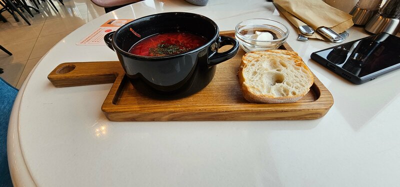 Борщ и сырники объедение. Рекомендую. Про кофе вообще молчу. Всё супер.