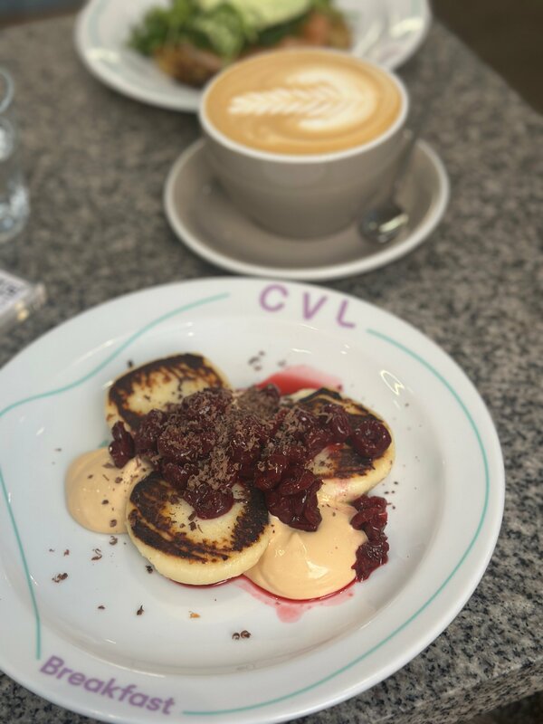 Потрясающие сырники с вишней и карамельным кремом ✨ Очень вкусненько 🌷 Персонал замечательный, очень приветливый и внимательный. Интерьер прям концептуальный. Местами не хватало либо мягкой спинки, либо мягкого сидения, нужны подушки или под спину, или под попу, чтоб было комфортнее.