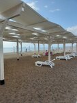 Пляж находиться рядом с детским лагерем, но это не мешает спокойно наслаждаться морским прибоем. Очень удобный пляж есть кабинки для переодевания, душ с краном для помывки ног. Туалет состоит из двух кабинок сесть раковина сушилка для рук. Удобно будет для инвалидов колясочников, дорожки проложены к самому морю. Вход с собаками запрещен. Лежаки по 200 руб. Можно под навесом расстелить покрывало это бесплатно.