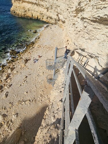 Это настоящее чудо, созданное местными дачниками. Пляж представляет собой лестницу, сваренную из карабельных ограждений и лестниц. С высоты пляж (который предтавляет собой лишь узкую каменистую полоску между отвесной песчаной скалой и морем) и лестница не видны. Чтобы добраться до него, нужно знать, где начинается спуск. В первый раз это может показаться сложным. В целом красивое место и всё же опасное, был прецедент когда мальчик с верху кидал камни с обрыва и ранил кого-то внизу, будьте аккуратны и внимательны друг к другу.