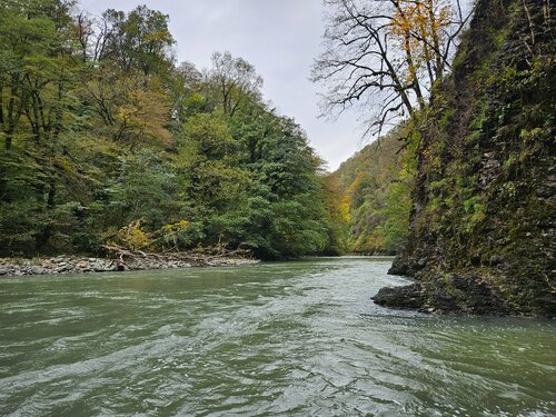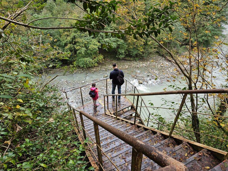 Мы начали свой путь со стороны конечной какого-то автобуса, не могу точно сказать номер, так как сами были на машине, парковать машину негде, скажу сразу раньше можно было подъехать очень близко к водопаду, но тогда смысл экотропы теряется, надо ставить шлагбаум, в момент нашего путешествия там проходили ремонтные работы по благоустройству тропы, поэтому въезжать было запрещено. Дорога грунтовая, широкая, местами перекопана. Подъём пологий. Очень красиво вокруг, мы были в октябре после дождей, немного сыровато, но зато водопад полноводный. На середине тропы стоит табличка с сайтом нац.парка где можно удалённо приобрести билет, если у вас нет наличных советую не пренебрегать советом и купить, потому что там где касса, непосредственно у водопада, интернета нет и надо платить наличными, 250р/взрослый, дети бесплатно. Многие возмущаются стоимостью и описывают бесплатные тропы, ссылаясь на отсутствии интернета, скамеек, автоматов с водой и едой, парковки, мусором. Но чтобы содержать все это и убирать мусор за недобросовестными гражданами нужны средства, зп кассира и охранника, чтобы следили хоть за каким-то порядком. Как можно мусорить в лесу, в таком прекрасном месте, очень много стаканчиков из- под кофе, видимо после красивых фото там и бросают их в лесу, обидно. После прохождения кассы вы почти у цели. На дороге будет пустующнее кафе и крутая железная лестница вниз, преодолев которую можно в полной мере насладиться красотой водопада. Внизу есть одна маленькая полуразрушенная скамейка. По дороге встретите собак, у нас были вроде не агрессивные.
