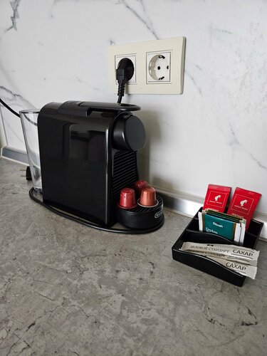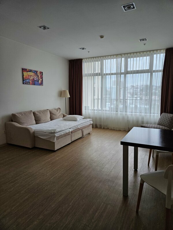 Отличное расположение. Парковка. Спуск к воде лестница, но этим никого не удивить, но если пройти дальше можно спуститься по парку, но далее все равно по лестнице. Ресепшен готов решить любой вопрос. В апартаментах есть все для комфортной жизни, а главное это отличная посуда для готовки. Конечно апарты требуют небольшого косметического ремонта, но все функционирует. У нас в номере не было посудомойки, но в других номерах есть. Вид из окна отличный. Стиральная машина работает. Ежедневная уборка и всегда чистое кухонное полотенце. Обязательно вернёмся.
