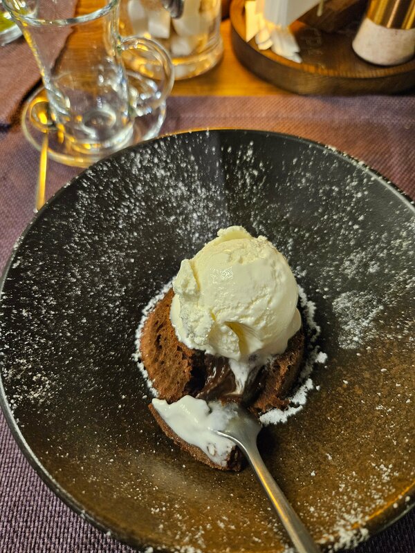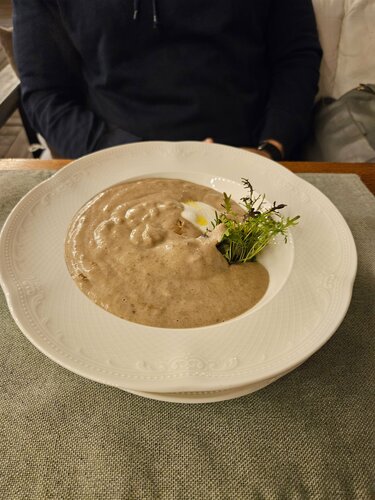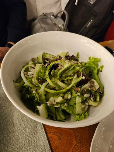 Парковка небольшая, на минус первом этаже, но света достаточно. Встретили , проводили. Есть 2 зонированных зала, приятный интерьер, но я бы заменила искусственные цветы на живые или на стабилизированный мох, сразу же уюта стало бы больше и класс заведения стал бы выше. Это моё пожелание. Приветливый , внимательный персонал и официант Ростислав . По меню было немного многовато перца в супе и карбонаре. Цены средние по Москве. Остались довольны. Есть небольшое детское меню. Были в пт вечером гостей было немного, в зале рояль, но живой музыки пока нет нам так объяснили.