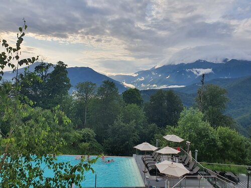 Впервые посещала спа- отель. Поэтому отзыв может быть излишне позитивным))) отличное местоположение. Не на побережье, где слишком влажно и не очень высоко, где уже есть кислородное голодание, как на Эльбрусе . Идеально. Бассейн очень теплый, но это для июня, а вот если осенью или зимой- супер. Красивые виды, хорошие классические "шведские" завтраки. Бани различные, возможность дополнительно приобрести массажи, уходы и пр. Номер хороший. Просто - хороший. Чисто, уютно, все есть. В том числе утюг и гладилка, сейф. Балкон с видом на горы. Советую селиться как можно выше- тогда не так слышно детей в бассейне, но это для слишком чувствительных. Про еду: заказала столик , хотела провести гастровечер). Заказала мидии в винном соусе. Подали мидии в раковинах, штук 15 в огромном горшочке. А соус на дне. Пришлось эвакуировать мидии из раковин в горшок, а потом ложкой есть их со дна). Но это замечание не испортило впечатление. Скорее- разнообразило.