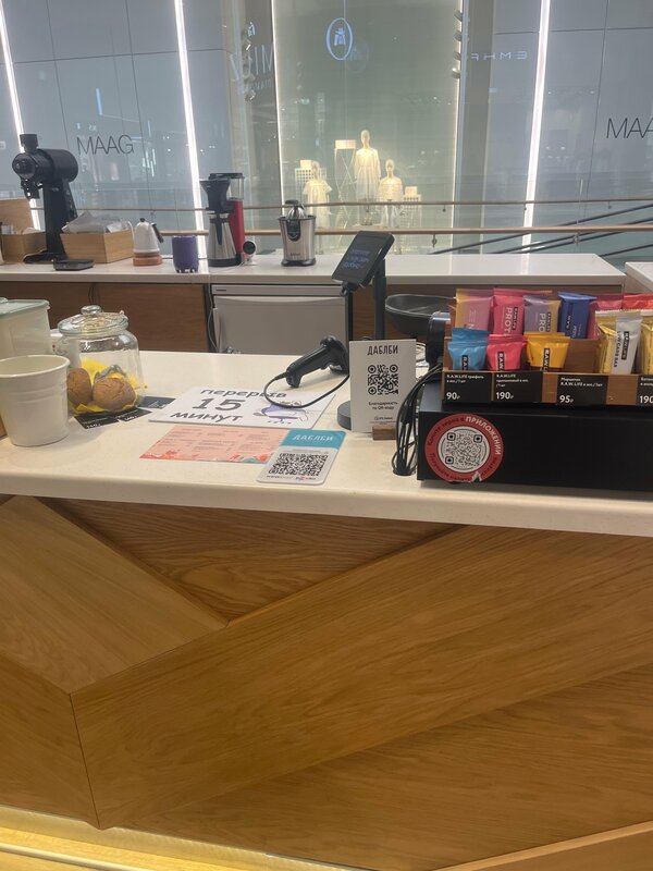 Продавец отсутствовал на место около 30 минут и табличка с надписью перерыв 15 минут-плохое объяснение. Дважды возвращались к стойке,но за эти полчаса никто не появился на рабочем месте