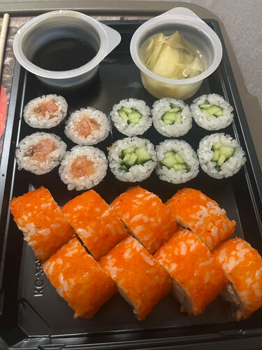 Заказали сет Аригато,в который входит тунец. Но дома обнаружила,что вместо тунца везде лосось! Так же в суши были обнаружены черные волосы.. Фото несоответствия прилагаю!