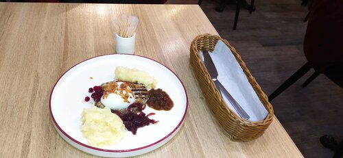 С учётом феерически огромного количества народа в центре Москвы в разных в точках общепита, то очень трудно найти, где нормально перекусить. Посмотрев по карте, решила выбрать я "Шоколадницу" (несмотря на недавний неудачный опыт). Что можно сказать? Тут вполне комфортно и уютно. Есть два этажа, чистый туалет, хорошее обслуживание. Можно выбрать тип заказа; так как мне не очень нравится заказывать через планшеты на столах, официантка спокойно принесла меню, чтобы сделать заказ по старинке. Хотя оплачивать всё равно пришлось через планшет. В целом всё хорошо, за исключением непосредственно моего ужина. В самом бифштексе попадаются жилы и хрящи, стало быть не особо качественное мясо. Сверху было яйцо пашот, но оно фактически сырое. Видимо, торопились и повар не доготовил; не только желток был жидкий, но и белок едва прихватился. Есть было неприятно, пришлось его сдвинуть. Вообще яйцо пашот очень сложное в плане приготовления, имхо, поэтому не всегда понятно, почему именно его выбирают. Зато топпинги были прикольные (луковые хлопья, соус с розмарином или что-то вроде, луковый джем, маринованная брусника, зелёное масло), совсем не острые, как я люблю. Правда через какое-то время после данного блюда началась сильная жажда, но в процессе ощущалось некая пересоленность. Наверное, пока на четвёрку за счёт качества приготовления самого блюда... Если буду ещё заходить, надо будет что-нибудь другое заказать.