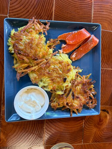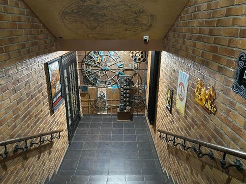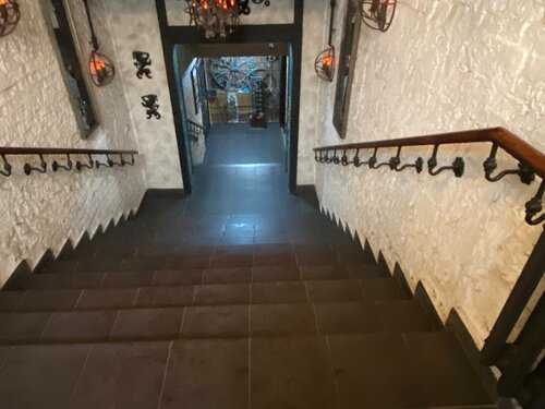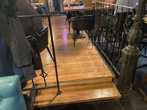 Вход в бар по пологому пандусу. Надеюсь, зимой не скользко. Дверной порожек высотой до 5 см. Сразу скажу, ступенек много. Вниз ведёт (соответственно по ней же и возвращаться) лестница в два пролёта с высотой ступенек до 15 см, с двухсторонними поручнями. На внутреннем входе в основное помещение бара ещё 3 ступени такой же высоты с односторонними перилами. С другой её стороны - решётка, что так же можно использовать при ходьбе. Есть ещё пара ступеней (высотой менее 15 см) если вы хотите присесть в центральной части бара на деревянном помосте. Там есть, с одной стороны боковой столб, с другой часть ограждения, которые можно использовать в качестве перил. В целом, людям с заболеваниями суставов ног будет не просто. В баре установлены диваны и удобные стулья. В этом, всё незыблемо. А вот внутреннее содержание поменялось. Как и везде, конечно, цены возросли. К сожалению пропала моя любимая, приготавливаемая ими, камбала. Поменялись официанты. Похоже, есть просто стажёр. Как- то угловато обслуживает гостей (вроде как с неохотой). Спросил у него как подключить вай-фай, ответил, что по звонку подключается. Я попробовал- нет. Подозвал другую официантку, она назвала нужный пароль, подключился. Картошка фри- не очень, ну, прямо очень - не очень. Взяли бургер, суп из белых грибов, фахитос с говядиной, мяса там бедновато. Рыбные котлеты с картошкой фри. Сушка для рук еле-еле дует, долго приходится сушить руки. Положение могли бы спасти бумажные салфетки, но их нет. Не порадовал визит к ним. Потеряли звезду.