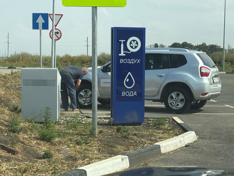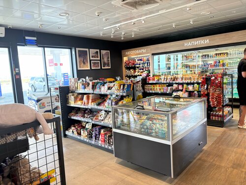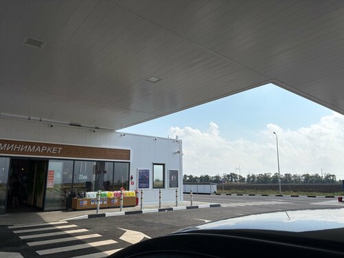 Большая заправка с большой парковкой. Объединена единым козырьком. Обеспечено беспороговое пространство. С большим магазином, чистыми туалетами. Но в туалетах не работала ни сушка для рук, ни салфеток не было. Хорошо, что ещё и в зале есть рукомойник. Там и салфетки были. Есть возможность подкачать колёса. Бензин АИ-95-К5 за 60,14₽.