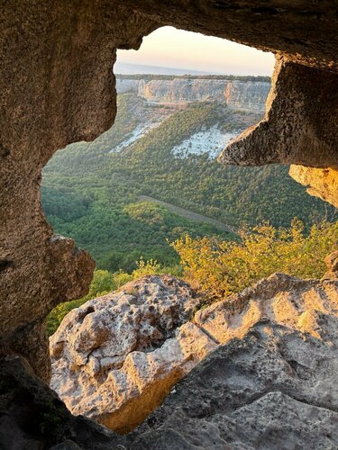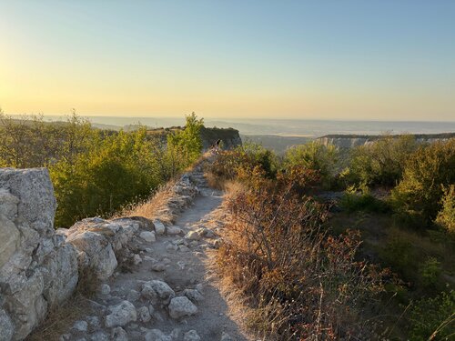 Древний город крепость в Бахчисарайском районе Крыма. Почти 600 метров над уровнем моря. В его истории, как и в истории всего Крыма отметились различные народы, обильно перемешанные между собой и различные государства. Основные этапы истории этого места - Византийское царство, Османская империя, а последними жителями этого места были караимы (крымские евреи). Часть этого народа продолжает проживать на территории Крыма. История этих мест трагична и крайне интересна. Легенды рассказывающие о том, как жители разбирали свои каменные дома, сбрасывая камни из которых они сложены, на головы штурмующих город османов. От города, конечно, остались только развалины, но они потрясающе выглядят в лучах заходящего солнца, с открывающимся видом на распростёртую внизу долину. В такие моменты, лучи заходящего солнца так отсвечивают в пещерах, что кажется, там развели костёр древние обитатели города и ты физически ощущаешь красоту местной природы, а также силу и беспощадность времени. Кажется, что до сих пор здесь бродят духи лучей, живших много веков назад. Это не «атмосферное», это - мистическое место. Добраться до него можно на автомобиле, но есть и пешеходные туристы. Доехать до древнего пещерного города возможно только на джипах из посёлка Ходжа-Сала. Туда и обратно -4000₽. Водители - позитивные, контактные ребята, с удовольствием делящиеся по дороге всей известной им информацией, останавливающиеся на дороге, чтобы мы могли увидеть Перемещаться на месте нужно очень острожно и быть крайне внимательными. Есть узкие тропы над ущельем, есть ступени достаточно отвесных лестниц, со стёртыми за века до зеркального блеска ступенями и от того весьма скользкими. Ограждений нет. Риски высоки. По легенде, сын местного князя, когда стало понятно, что город не устоит от штурмующих османов, чтобы не оказаться в плену, спрыгнул со скалы в пропасть. И это был не единственный человек сорвавшийся в пропасть окружающую пещерный город. Для людей страдающими проблемами ног, эти участки являются непреодолимыми.