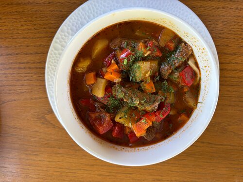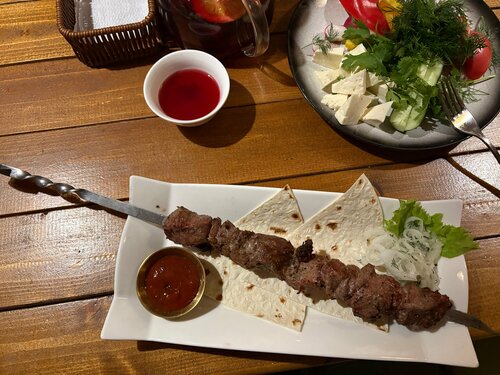Ресторан занимает огромную площадь в виде прямоугольника. На его территории есть пруд, множество отдельных домиков на большие компании, несколько террас закрытых от дождя. Чистые туалеты. Есть линия небольших кабин с дастарханом. Внимательные, отлично ориентированные в меню официанты. В основном блюда татарско-азиатской кухни. Продажи алкоголя нет. Впервые я столкнулся с тем, что подаваемое блюдо выглядит даже аппетитнее чем его изображение в меню. Высококачественная работа кухни выражена не только в красоте подачи, вкусе блюд, но и в небольших нюансах, подчеркивающих качество работы поваров. К хумусу, в качестве украшения были добавлены бланшированные помидорчики и с них была снята шкурка. Солёная хамса была очищена так, что в ней не было ни одной косточки. Еда сытная. Порции полноценные. У нас была очень большая компания, очень голодны после похода в горы, на некоторые блюда не хватило сил даже попробовать, сколь было сытно. Забрали с собой. Заказали: овощная нарезка за 600₽, лагман за 450₽, шашлык из баранины за 820₽, филе трески с пюре из цветной капусты за 980₽, хумус за 450₽, мезе за 710₽, баклажаны по тайски за 650₽, айран за 90₽. Десерт Шу за 450₽ и пахлава бакинская за 200₽. Напиток чёрная смородина-базилик 0,8 л - 520₽, кофе в турке за 180₽. Всем всё безоговорочно понравилось. Для меня очень важной частью оценки качества кухни, является чебурек с бараниной, в тех местах, где его готовят. Их чебурек за 220₽ - правильная форма, размер, есть бульон. На мой вкус немного маловато мяса, но главное это вкус. Вкус - правильного (наконец-то) чебурека с мясом. На следующий день вновь заехали к ним. Ни слова нарекания. Всем спасибо! Работа на 10 баллов.