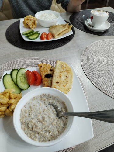 Были проездом, искали где перекусить. Время открытия не посмотрели. Открытие в 10. Но нам любезно предложили завтрак, хотя время было около 9 часов и велось обслуживание гостей отеля. На выбор в меню было предложено около 6 комплексных завтраков. Так как в одном из выбранных нами завтраков не было одной позиции, милая девушка официант с нами согласовала замену. Хочется отметить желание персонала угодить гостям. Помещение уютное, чистое, светлое. В туалетной комнате очень приятный аромат, и видно, что уборка ведётся вовремя и качественно. Не устояли и сфотографировали свою собаку с пёсиком, встречающим гостей у входа. Рядом расположен сквер и площадка, с которой открывается прекрасный вид на реку. Хорошее место. Можно рекомендовать.