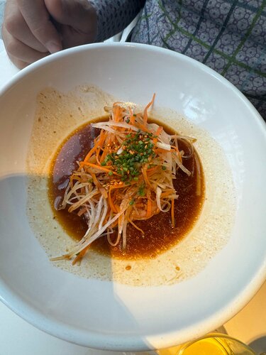 Я давно не испытывала подобного разочарования …В центре Москвы , в очень приятном интерьере ( ресторан прекрасно декорирован) и вдруг такое гастрономическое фиаско. Это заведение по названию и по концепции позиционирует себя как место , где можно насладиться свежим ( без заморозки ) дальневосточным тунцом . Но именно это и оказалось большой проблемой. Поскольку цены на тунец в ресторане высокие ( естественно , тунец не дешевле удовольствие) и его , по заверению персонала не замораживаю (он охлаждённый ) и наплыва посетителей не наблюдается, тунец , к сожалению портится. Мы были одни в ресторане в выходной день в обеденное время. Рыба , если она не заморожена , очень быстро переходит из разряда «свежая» в разряд « это лучше не есть». Именно поэтому нам пришлось отказаться от поке с тунцом ( 1 300 руб.) и ризотто с тартаром из тунца ( 1 390 руб.) . Тунец был явно не свежий. Мы с мужем съели не много ( были обескуражены подобной ситуацией с тунцом и решили не рисковать ) и заплатили 3 990 руб. Попробовали : Том Ям 2 порции (890 руб) - вкусно ; чука ( 420 руб.) - закуска микроскопическая около 50 гр. ;Ролл Филадельфия с лососем ( 1 310 руб.) - не плохо , но лосося не много ; чай улун ( 480 руб.) . И в завершение не очень приятного обеда финальный печальный аккорд - десерт Моти со свежей клубникой и соусом маракуйя ( 590 руб.) От этого медуза образного десерта я тоже отказалась . Я в большом удивлении , что подобное « недоразумение» возможно подавать и продавать посетителям ресторана. Такое расползающееся моти простительно новичку в кулинарии , но не профессиональному повару. Ещё один неприятный нюанс : в меню почему-то не указывается вес продуктов и при заказе стейк из лосося ( 1 700 руб.) оказалось , что это цена за 100 грам. Это не допустимо когда в меню нет фактической цены за блюда или указания , что это цена за 100 грамм. Вывод : очень жаль , но подобное заведение явно требует другого повара и с хранением тунца надо быть осторожнее и не рисковать здоровьем посетителей./ Приятный нюанс : очень любезный и адекватно реагирующий на критику персонал: спокойно отнеслись к моим притензиям и убрали из моего счёта позиции от которых я отказалась .