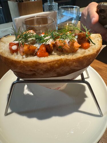 Это конечно же не дешёвое удовольствие, крабы и хорошее вино , это гастрономические изыски с высоким ценником. Но если бюджет позволяет и вы любите этот деликатес, непременно загляните в это изысканное заведение отмеченное в 2022 году в гиде Michelin. Я посещала этот ресторан ещё в далёком 2016 году, когда знаменитые гуру кулинарии братья Березуцкие только открыли первый ресторан в этой тематике. Тогда я ощутила одно лишь чувство , после дегустации блюд в этом ресторане - чудесно, Но в это песещение я могу сказать - не плохо. В 2020 году братья Березуцкие покинули своё детище и к сожалению гастрономический уровень опустил планку. Интерьер и обслуживание остались на том же хорошем уровне , а вот количество краба в блюдах явно минимезировали . Наш обед на двоих без спиртного стоил 7 214 руб. с учётом скидки . В будний день с 12.00 до 16 .00 скидка 15%. Мы попробовали : две порции острого супа с морепродуктами ( 2 580 руб.) - стилистика Том Ям , но морепродуктов не много; Оливье с крабом ( 1 050 руб.) - хотелось бы краба побольше; Посылка с Камчатки с тремя видами краба ( 1 540 руб.) - концепция блюда интересная ( имитация бандероли с клешнями краба) , но в прошлые времена посылка была по внушительней; голубцы с крабом с соусом из сморчков ( 1 550 руб.) - вкус краба едва ощущался ; трубочка с фисташковым муссом ( 650 руб.) - нежный десерт ; капучино ( 450 руб.) ; двойной эспрессо ( 390 руб.) ; вода Edis ( 450 руб.). Удовольствие мы конечно же получили : изысканная обстановка эффектно декорированного старинного подземелья , любезное обслуживание и вполне вкусная еда. Но ностальгические воспоминания всё же внесли ноту сожаления и ощущения- раньше было лучше.