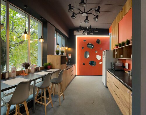 Ставлю 5⭐️ хостелу с замашкой на средний по сервису отель! ✔️Относительно новый, мебель и сантехника «свежая», современный ремонт; ✔️Локация - центр, везде удобно и близко. Рядом много кафе и ресторанов; ✔️В отсутствии полной загрузки можно без неудобств воспользоваться общими санузлами, тк один из 4х ВСЕГДА свободен. При заселенном наполовину отеле я без проблем проводила в ванной по 40 минут с утра и вечером; ✔️Есть ВСЕ необходимое - кухня со всем оборудованием и посудой, кому нужно/ общая зона отдыха с ТВ, отличные санузлы (4 шт. совмещенных на весь хостел)/ гладильные принадлежности; ✔️ОТДЕЛЬНЫЕ капсулы для каждого человека. Если бы не это, вряд ли бы сняла хостел… ✔️Идеальная чистота везде; ✔️Отзывчивый персонал; ✔️Кофе/ чай в свободном доступе. ✔️Хороший Wi-fi; Из минусов: 📛Очень душно в этом «бункере» взаперти, принудительная вентиляция не справляется и она очень шумно работает, на ночь приоткрывала дверь; 📛После 22 часов закрывают входную дверь на ключ, приходится звонить; 📛Находится на 2 этаже со входом по крутой лестнице, не очень удобно тащить туда чемодан. Но видимо там и не останавливаются с большими сумками :) В целом я осталась довольна, но, повторюсь, в условиях загрузки не более, чем на 50%. В летнее время при full заселении, не очень большое удовольствие слушать там чужой храп через картонные перегородки и спать с открытой дверью.) Предполагаю, что будут траблы и с заходами, особенно долгими, в санузлы, тк они же душевые.