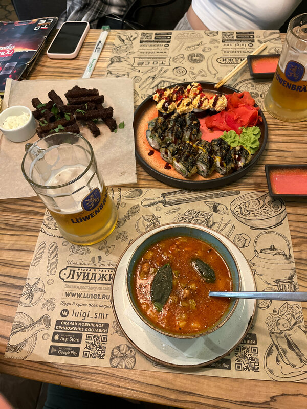 Ресторан действительно на 5 баллов. Очень хороший персонал вежливый, дружелюбный. Приятная теплая атмосфера, которая обволакивает тебя уютом, с интерьер с отсылкой в Италию .Просторный зал ресторана тоже плюсик к заведению.Широкий выбор в меню вначале насторожил, так в настоящее время делают упор на небольшой ассортимент и оттачивают вкус блюда, но все -все что заказывали было вкусно и сет роллов и пиво и фирменный суп Луиджи. Спасибо