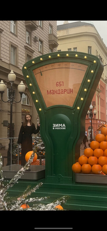Красиво украсили улицу, ярко! Классная фишка - весы, сколько ты весишь в мандаринах. Можно эту локацию взять в копилку для прогулок.