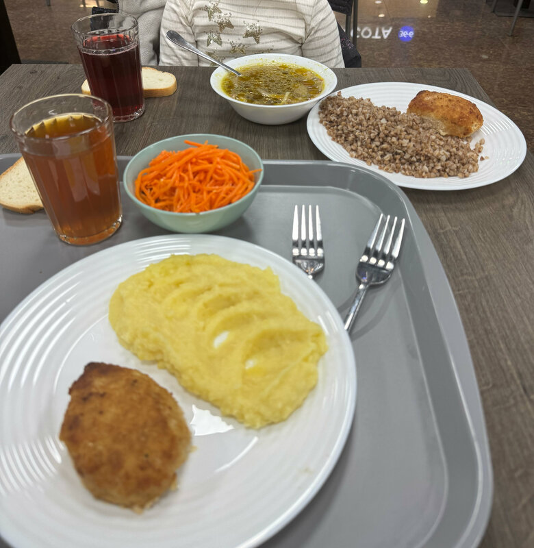 Цены приемлемые, еда на 4ку, не могу сказать что прям очень вкусно и по домашнему, но второй раз бы пришла. Не хватает салфеток на столах, бегать их искать куда-то не хочется. На двоих поужинать 600р, в целом очень даже норм, морковка вкусная, котлеты не сухие, но лука многовато, суп немного безвкусный, гречка и пюре ок.