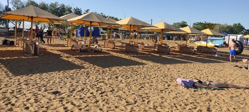 Отличный пляж, мягкий " золотой" песок,прекрасное, чистое море,тенты, шезлонги, развлечения для детей, парковка близко,рядом остановка автобуса.Хорошиий пляж для семейного отдыха!