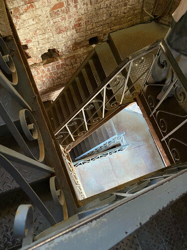 Узкие металлические ступени, а наверху вы увидите сетку и арматуру наваренную на края башни, к которой страшно подойти. Крайне не рекомендую для посещения.