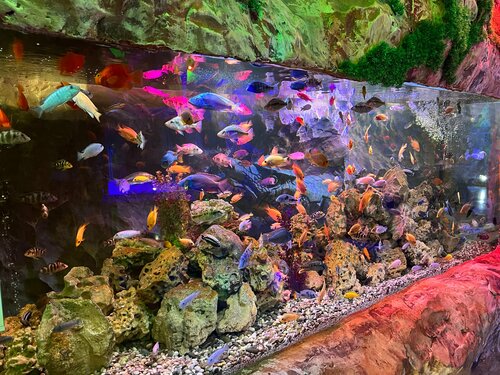 Аквариум, цены 2024 года почти на уровне московского Москвариума на ВДНХ, 1000₽ вход для подобного уровня это ОЧЕНЬ дорого. Психоделичный дизайн 2000-ых годов, судя по всему, рисовали персонажи после Казантипа. Персонал пытается вывезти бесплатной фотосессией на ваш телефон на фоне 3Д полов. Кстати, туалета для посетителей нет, предложили сходить в платный в 300 метрах, наверное персонал тоже туда ходит. А, ну и как обычно в Крыму, картой платить нельзя, берут наличкой, чеков не дают. Видимо налоги в российский бюджет платить не особо хотят.