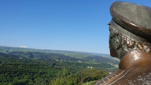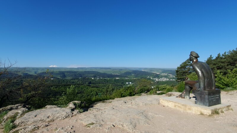 Скульптура воплощает облик офицера дореволюционной Российской армии - собирательный образ поручика, она перекочёвывала с этого места в Нижний парк, но опять по просьбе жителей вернулась сюда, на смотровую площадку Красное Солнышко. Хотелось бы, чтобы рядом разместили табличку с QR-кодом с подробным описанием истории её создания, скульптора и мастера , кто отлил этот памятник. Приезжая сюда всегда по традиции с ним здороваюсь, и смотрим вместе на далёкий Эльбрус! В любую погоду он обращает внимание людей и заставляет задуматься о скоротечности и бренности нашей жизни в сравнении с величием Эльбруса.
