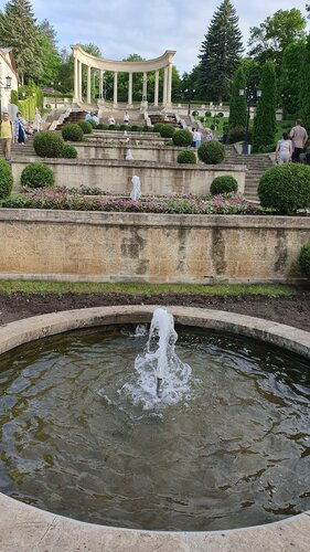 Каскадная лестница- один из узнаваемых символов Кисловодска. Два года назад после реставрации она стала выглядеть очень торжественно и красиво - новая отделка фонтанов, стеклянные струи, фонтанчики, ночная подсветка. В этом году каскадная лестница выглядит хуже - красивые розы вдоль лестниц, но фонтаны стали меньше, в 18ч фонтаны выключаются совсем, ночной подсветки нет, как бы захиревшая, особенно по сравнению с новым соседним бульваром на улице Ленина. Вечерами ситуацию скрашивает и разнообразит многоголосый хор лягушек, раздающийся от воды