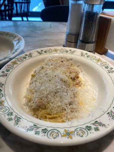За скромным фасадом укрылся ресторан с акцентом на итальянскую кухню. На входе Вас встретит хостесс, поможет выбрать место для размещения. Пока Вы выбираете блюда и напитки из меню Вам предложат цитрусовую воду, которую бесплатно подают в качестве «аперитива». Время ожидания заказа протекает не заметно, интерьер интересный, музыка приятная, посуда и сервировка красивые. В отдельных случаях до подачи заказанных блюд Вам предложат хлебушек с «маслом», который также не включают в счет. Хлебушек потому что ломоть хлеба на вкус нежнейшей текстуры. Блюда вкусные при этом казалось бы уже обыденные блюда по вкусовым ощущениям открываются в этом ресторане по новому с оттенком вкуса. По состоянию на сентябрь 2025 г ценник на блюда от 600 руб и выше, напитки в зависимости от выбора. Перекусить будет стоить порядка 1000 р, плотно поесть 1500-2500 руб., с алкоголем еще +500+1500 тыс руб. Действуют акции со скидками на заказ на вынос 10%, кофе с собой 10%, кофе с собой в свою чашку 20%, в день рождения 20%, есть система лояльности.