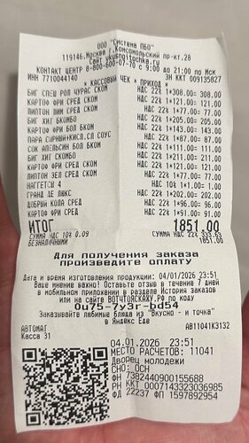 Впервые сталкиваюсь с таким хамством во вкусно и точка. Началось всё с грязного пола в туалете, запаха мочи и валяющейся на полу картошки, а закончилось оставшей вялой едой и неоднократным хамством со стороны персонала. Сразу после закрытия, нас начали выгонять, под предлогом того, что мы уже доели (цитирую: "Ну, как я вижу, вы уже поели и просто болтаете сидите, мы закрыты уже, уходите из заведения"), но это было не так. Спустя минут 5-7, когда мы действительно доели, пошли к двери, которая была закрыта. Попробовав открыть дверь сначала в одну сторону, а потом в другую, на нас начали кричать, что мы сломаем им дверь и до конца жизни мы за неё не расплатимся. Прикрепляю фотографии грязного пола с картошкой, чека заказа. Фотографировать туалет не стал, увы