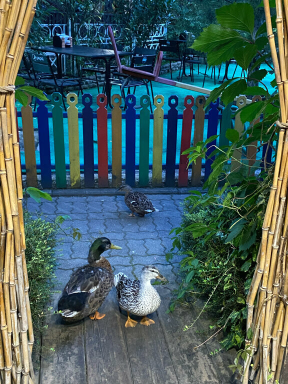 Интересные необычные блюда и оооочень большие порции. Колоритный антураж и отличное обслуживание. Бонусом прикольные утки-попрошайки)