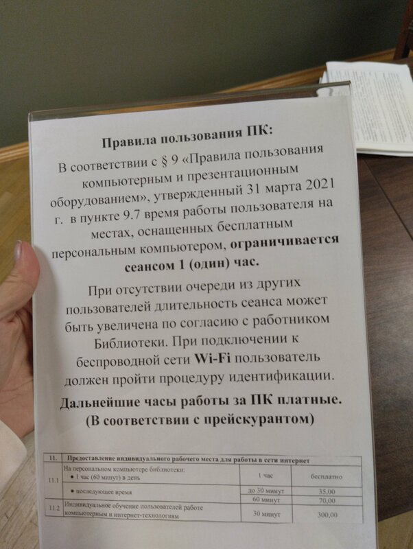 Пришла 23.10.24 в библиотеку по читательскому билету, а именно в читательский зал поработать за компьютером. С обеда было всего три человека, сам зал рассчитан на 11 посадочных мест. Позже сотрудница этого зала огорошила меня "вам нужно будет покинуть зал раньше Вашего запланированного времени", когда я шла по коридору. Естественно, я поинтеревалась причиной на что она сказала я тут нахожусь более часа и что все, что больше подлежит доп. оплате, либо нужно покинуть библиотеку, также, что я не занимаюсь научной работой (что?!) и сижу за самым лучшим компьютером (что?!!). Я попросила ее дать документ где это прописано, на что она принесла из подсобного помещения заламинированную бумагу никем не утвержденную (фото прилагаю), я обратила ее внимание, что зал пуст и я в государственной библиотеке, и такое встречаю впервые...она безразлично пожала плечами. Далее я ознакомилась в интернете с положением, где рекомендовано, действительно час пребывания за компьютером при условии большого спроса людей на компьютеры (что логично). Попросила показать утвержденный прайс... Сотрудница представилась Светланой Викторовной Персиенцевой, утвержденные документы не показала, просто объявив о том, что она этот не из головы берет. Также, она приставала к пришедшему мужчине с зонтом ввиду того, что она хочет чтобы зонт был оставлен на первом этаже, что с него натечет лужа...мужчина даже открывал зонт чтобы продемонстрировать что он абсолютно сухой и попросил впредь не цепляться к нему. Вот из-за таких сотрудников желания ходить в данную библиотеку абсолютно нет!