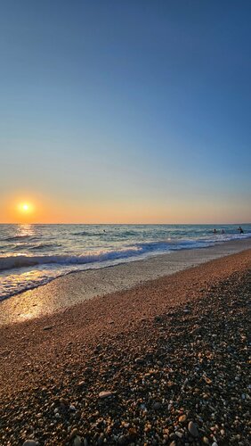Хороший пляж. Протяженный. Галька. Можно арендовать лежак или беседку со шторками. Рядом есть пара волейбольных площадок. Есть переодевалки. Центральные дорожки деревянные. Есть спасатели. Еду и напитки можно приобрести в киосках. Санузлы - синие биотуалеты. Даже с туалетной бумагой. Стоянка довольно большая, но неасфальтированная, пыльная, несколько неровная, как и дорога от асфальта - метров 300