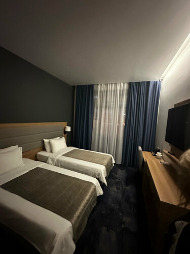 Из плюсов: Расположение супер удобное на берегу моря, локально все близко и удобно. Большие попугаи Приветливый персонал До 00 работает чайная на улице Есть паркинг Большие номера (брали стандарт, хотели доплатить и повысить категорию, но было более чем достаточно) Из минусов: Скудный завтрак состоящий на 70% из полуфабрикатов, кофе отвратительный, как платный, так и включенный в завтрак (бармен, кстати, хамоват максимально, но скрашивает девочка администратор приветливая и милая) Гостиница полностью не запущена (стройка не закончена), на балкон не выйти т.к. лежат стройматериалы В целом одно другим перекрывает.