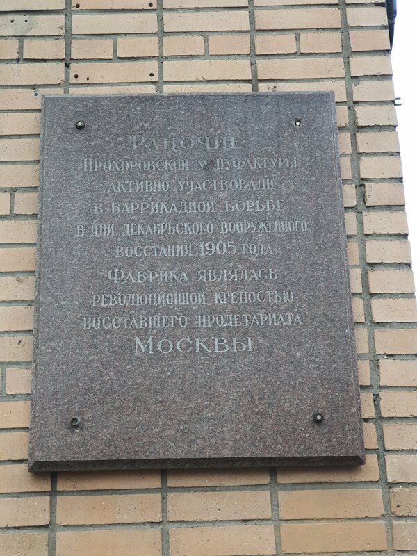 На южной стороне д. 15с8 по ул. Рочдельской, во дворе бывшей «Прохоровской Трехгорной мануфактуры» сохранилась в весьма усеченном виде мемориальная плита «в память рабочих, расстрелянных царским самодержавием в 1905 году во дворе фабрики». Все расстрелянные были молоды, в возрасте от 18 до 26 лет. Четверо 18-летних, трое 20-летних, двое 21-летних и по одному 22, 23, 24, 25, 26 лет от роду. Тринадцать рабочих «Товарищества Прохоровской Трехгорной мануфактуры» (по двое из красильного, механического, отделочного отделений, по одному из амбара, коландрового и ткацкого отделений, химической лаборатории и один ученик) и один представитель «Промышленного и торгового товарищества братьев А. и Н. Мамонтовых». Похоронены казненные на Ваганьковском кладбище в братской могиле.