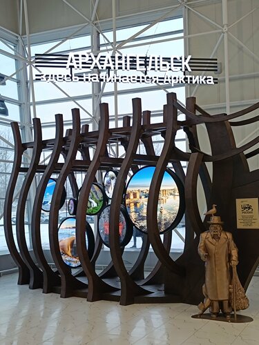 Красивый обновлённый аэропорт. Много приятных кафе, магазины сувенирные, водоросли. Новое здание завораживает историей, Ломоносов, Писахов, Абрамов, а также макет Подводной лодки