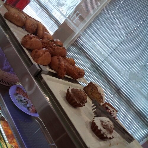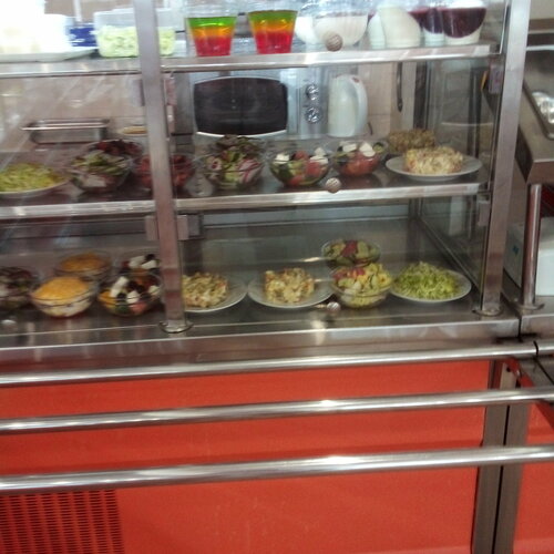 Персонал приветлив( наверное, работают рядом с клиникой). Мало мобильным людям помогают не только в выборе пищи, но и подают ее на стол. Есть пандус (устанавливают по необходимости) для людей на колясках, есть стул- столик для маленьких детей. Бывает много посетителей ( обычно обеденное время) и приходится ждать в очереди. С утра есть шанс подобрать еду по диете. Меню разнообразное . Новые блюда в течении дня подают, выдерживая деления на завтрак, обед, полдник или ранний ужин.Еду и напитки можно забрать с собой ( оформляют в свою фирменную упаковку). Фото сделала около 14–00 ( кафе работает до 16-30).