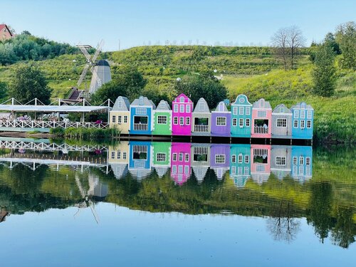 Реально Клёвые беседки😊 15 тыс и домик у воды ваш с 10:00 до 23:00! Беседки расположены на самом берегу. Небольшая терраса и сам домик. Внутри несколько столов, достаточное количество стульев, что-то типа барной стойки, телевизор, розетка, освещение и батарея на случай прохладной погоды. На террасе лавочка, мангал и мусорный бак. Уличное освещение включается централизовано. Беседки расположены так, что никто никому не мешает. В районе 8 беседки расположен приличный комфортный туалет и место, где можно помыть фрукты овощи если не сделали этого заранее. Красивая территория: качели, мини зоопарк, зайчики и куры свободно бегают по территории, что очень радует детей😊 Рядом ресторан, а по мостику через речку можно перейти на другой берег в кафе с домиками в голландском стиле. Место очень красивое, чистое и уютное! Обязательно вернемся снова