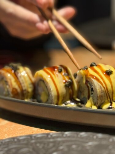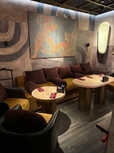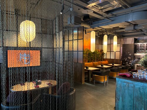 Ресторан расположен с торца Легенда Цветного. Преодолев высокую лестницу вы оказываетесь в весьма уютном и хорошо зонированном помещении. Приятная атмосфера, действительно хорошее зонирование, ощущение уединения. При необходимости есть возможность расположиться в индивидуальных небольших кабинах. Меню небольшое. Но, по мне, это и хорошо. Значит кухня выверена до идеала. Изначальная идея посещения была продегустировать местный рамен- «сею рамен с лингвини». Полученный результат- слабоват и меня не впечатлил ни бульон, ни его сочетание с лапшой. Я не получил радости от его поедания. Заявленный вываренный в течении 48 часов бульон показался мне не аппетитным, либо специи перебивают вкус, либо 48 - цифра придуманная маркетологом. Ростбиф, в виде «говяжьей вырезки» был далек от изначального рецепта со стриплойном, который мне рекомендовали для посещения. Похоже для удержания цены кухню адаптировали по снижению ее качества. Вернул. Роллы: Гамберо- неплохо, хороший зрелый манго, но больше подойдет любителям сладкого. Торуофу также не впечатлили- огурец превалирует над вкусом, забивая гребешок однозначно, креветка более-менее вытягивает. Но их мы так и не доели. Как итог - рамен и роллы- не самое сильное место здешней кухни. Зато сашими гребешок и лосось были хороши, димсамы с креветками и крабом брали дважды- просто огонь. Хорошие лимонады и неплохая винная карта. Атмосфера решает все. Однако, здесь предлагают кальяны. Подумайте если вы не их любитель. Запах тяжелый и вентиляция не всегда справлялся. Обслуживание отличное- нам повезло с Кирой- ее уровень явно превосходит данное заведение. Полная информация о всех блюдах и их трое по вину без напоминания. Вкупе с ее низким бархатистым голосом она сделала наш вечер. Была попытка ее подстраховать другим сотрудником, но после разбитой им посуды все вернулось на круги своя. Не снимаю звезд- проблемы случаются. Нужно просто понимать что заказать из меню, чтобы не испортить свой вечер.