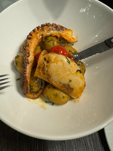 Перепутав рестораны, решили последовать знакам и оказались тут. Незатейливый, но приятный интерьер, небольшой, но уютный зал. Хорошее меню и отличное обслуживание от Ильи и его коллеги. И поболтать и посмеяться. Попали в период между посадками и смогли уединенно оценить и качество кухни и юмор сотрудников. По еде все отлично. Кухня на высоте. Брали тар тары из лосося, гребешка, эскарго, уху, судака и осьминога. Еще микс морепродуктов на гриле. Все вкусно и действительно стоит каждого запрошенного рубля). Один момент- тартары подают засыпанными кунжутом. Если вы не фанат- заранее предупредите. Винная карта небольшая, но сбалансированная. В целом - огонь. Точно вернусь в следующий визит в Питер. Парням - благодарность!