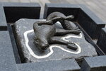 Милый прикольный памятничек... Если не искать специально, можно и не найти. А так, вполне себе, правда не просто белка с пистолетом, а мертвая белка с пистолетом, обведенная мелом.