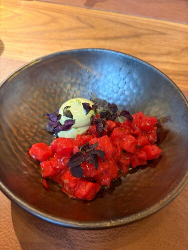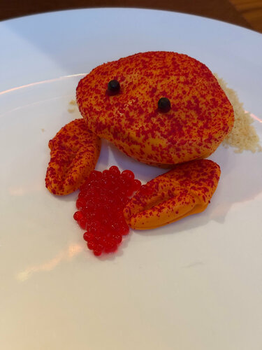 Впервые были с молодым человеком, очень понравилось тематическое оформление зала, даже серьги и пуговицы у официантов в виде крабов, такое внимание к деталям! Зашли просто перекусить, поэтому целого краба не брали, но равиоли с крабом - совершенство! Отдельно на фото хочу отметить севиче из тунца, приятная пряная заправка и сама текстура блюда, и этот милашный и вкуснейший десерт крабик) вернемся еще однозначно!