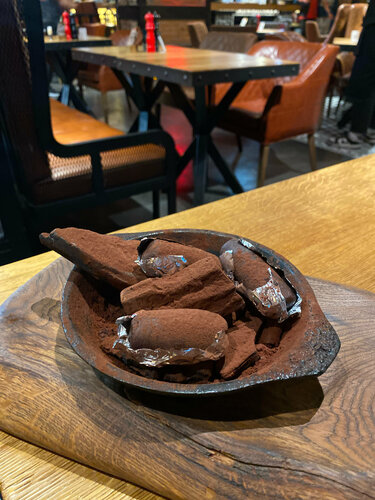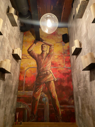 Интересный Мясной Ресторан На входе встречает классный байк ❤️ Заведение одноэтажное ,не сильно большое ,есть небольшая детская комната ,интерьер интересный и атмосферный. Приятная атмосфера ,и вкусные блюда ,меню на двух языках (удобно для иностранцев).Обслуживание отличное .Цены выше среднего по кафе ,но оно того стоит . Единственное что смутило это общий туалет для дам и господ . Все таки такие места должны быть раздельными ,чтобы никто никого не смущал .