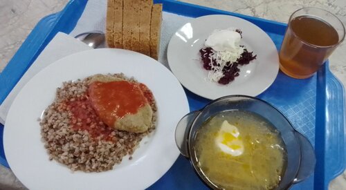 Для меня большой плюс - отсутствие толпы в пиковое время, и достаточное меню, если припозднился. Просторный зал без интерьерных изысков, большая ТВ панель, микроволновая печь для подогрева. Широкий ассортимент горячих блюд и выпечки. По стоимости +/- середина по городу, 320 руб., что на фото. Ещё один показатель - атмосфера на кухне. Дикости и матерных слов не замечал. Приглашают провести банкеты и дни рождения от 1000р./чел, поминальный обед от 650р./чел. Пробуйте.