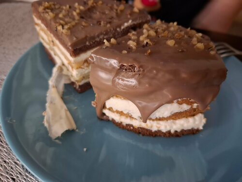 Торт шоколадно маковый. Вкусный. Оценил бы на 5 балов, однако бумагу не убрали между слоёв. Может много работы было у кондитера, отвлёкся. В целом советую, вам понравится.