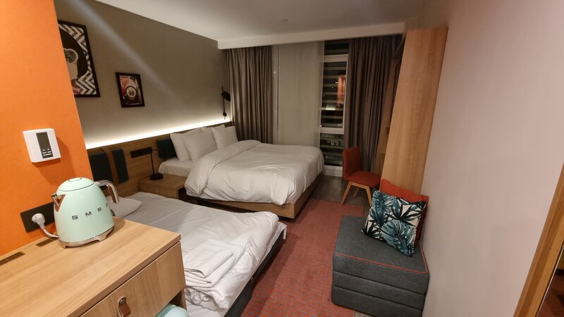 Из плюсов: - за эту стоимость хорошее расположение - красивый и чистый номер - в целом обстановка и дизайн отеля очень хорошие - вкусные завтраки, но одинаковые. Менялась толко каша, и довольно скудный выбор. Зато можно самому делать фреш и печь себе вафли. Из минусов: - стойка размещения находится на втором этаже - на второй этаж можно подняться по лестнице или на отдельном лифте, который не идёт на жилые этажи. Приходилось каждый раз поднимается на второй этаж, проходить через бурную зону к основным лифтам. - во время нашего проживания (7 дней) не работал второй лифт. Очень долго ждали лифт, особенно утром. - в номере нет шкафа, всю неделю вещи лежали в чемоданах, очень не удобно.