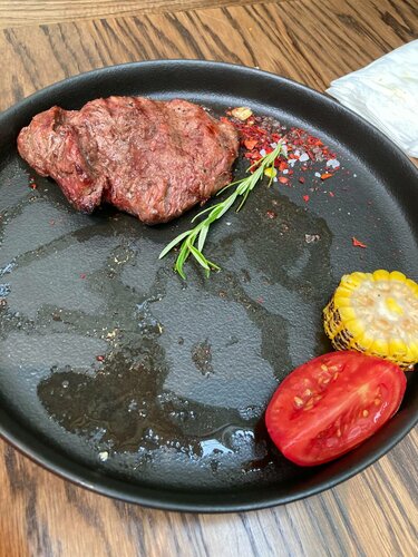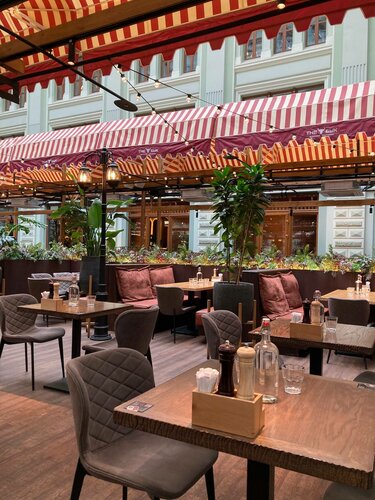 Пришли к открытию ресторана в будний день к 12 ч, очередь уже ожидала. Зашли спокойно, столов много. До 17ч большинство блюд по 350р, после 17ч по 400р. Стейк взяли за 550р. Попробовали вителло тоннато. Порции хорошие, немаленькие, еда отменная. Бесплатная вода на каждом столе. Для оплаты можно не звать официанта, достаточно на столе отсканировать клик код и можно оплатить. Мы посидели около часика. При выходе уже стояла внушительная очередь ожидающих. Место отменное, рекомендую.