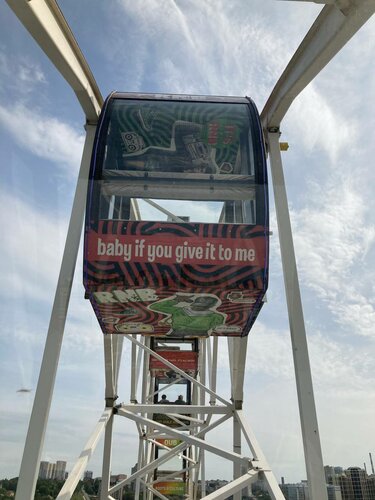 Интересная и оригинальная задумка. Каждая кабинка колеса обозрения представляет свою музыку и можно выбрать именно ту кабинку, в какую хочешь сесть и послушать свой любимый стиль музыки. Вид открывается прекрасный со всех сторон.